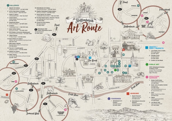 Das Ergebnis ist die neue Arte Route Karte mit öffentlichen und privaten Sammlungen von Galerien, Museen, Märkten, Gießereien, Skulpturengärten und öffentlichen Open Air  Kunstausstellungen, sowohl im historischen Kern Stellenboschs als auch auf den nahe gelegenen Weingütern.